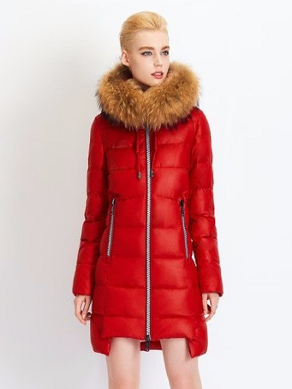 Женский пуховик со съемным мехом енота красный